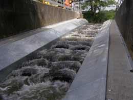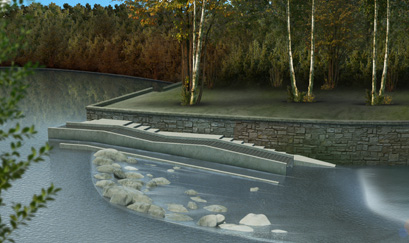 In this artists impression the canoe shoot is in the foreground, then the fish pass, which includes an Elver pass, and low water portage steps which double as maintenance steps.